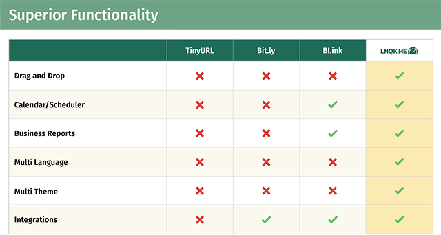 Lnqk.Me is packed full of features you won't find anywhere else. We have succeeded in bringing cutting edge design and innovation to the field. The table below shows a sample of our core functionality set by comparison to the status quo solutions on the market.